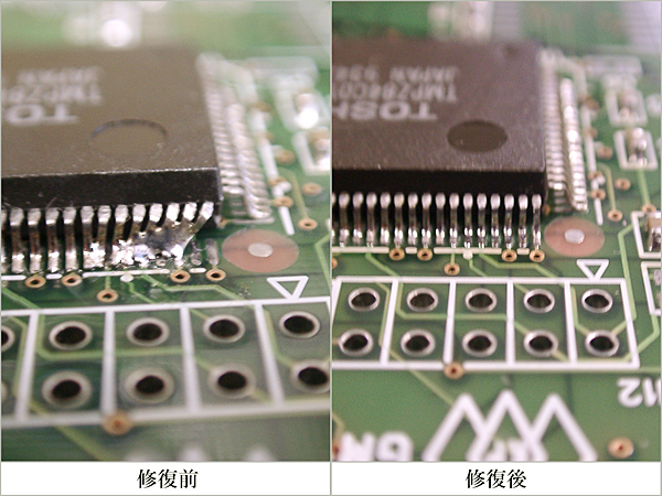 当時、評価用基板のICが完成し、社内での実験作業をしていたところ、ちょっとした不注意が原因でICの足をグチャグチャにしてしまいました。実験作業の完了まであまり時間が無く、時間とコストを考えた場合、あらためてICを購入することは難しい状況でした。そういった状況をリッツさんにご相談したところ、1枚だけの作業にも関わらず低コスト、短納期にて元通りに近い形で修復して頂けたので非常に助かりました。